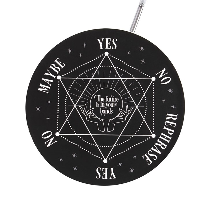 With a mystic pentagram design, this metal decision maker features a spherical pendulum that magically selects one of six responses. Simply ask your desired 'yes' or 'no' question and watch as the pendulum cycles through the possible outcomes and lands on your destiny. Perfect in size for keeping on desktops and side tables for quick decision-making.