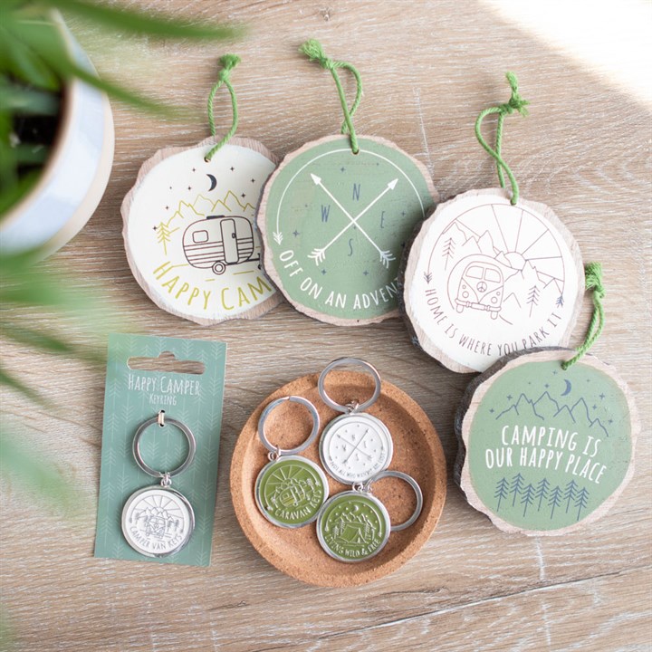 This display includes 16 wood slice-effect hanging signs perfect for any lover of the outdoors, camping or caravanning. 4 assorted styles include 'Camping is Our Happy Place (green), 'Home is Where You Park It' (cream), 'Happy Camper' (cream) and 'Off on an Adventure (green). Comes on a matching MDF countertop display.