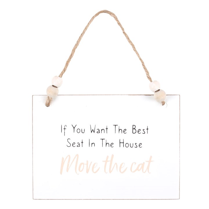 The perfect token gift for family and friends, this white wooden hanging sign features the text 'If you want the best seat in the house, move the cat'. Approximately 10cm x 14cm with twine hanger and finished with a wooden beads.
