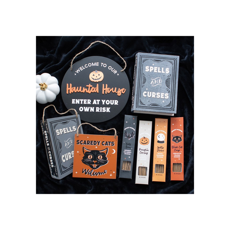 Decorate for the Halloween season with this vintage inspired hanging sign with a 'Scaredy Cats Welcome' design. Featuring a mysterious black cat on a bold orange background, it's an eyecatching piece which is perfect for helping to create a spooky atmosphere for the season.