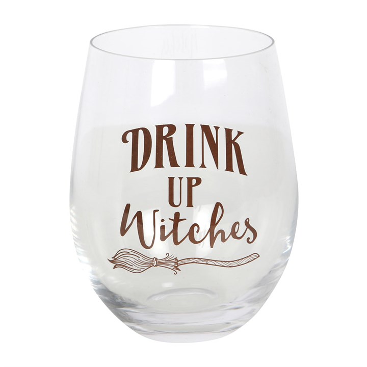 Perk up your next coven meeting or girls' night in with this fun stemless glass that's perfect for wine, gin or other potions and tonics. Features a whimsical broomstick illustration with 'Drink up witches' text. 500ml capacity. Hand wash only.