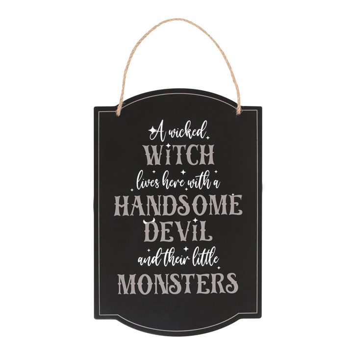This quirky hanging sign is the perfect way to decorate for a spooktacular Halloween with fun 'A Wicked Witch Lives Here with a Handsome Devil and Their Little Monsters' text accented with a dash of magic. Perfect for a door or entryway, this sign is a must-have for any family of ghouls.