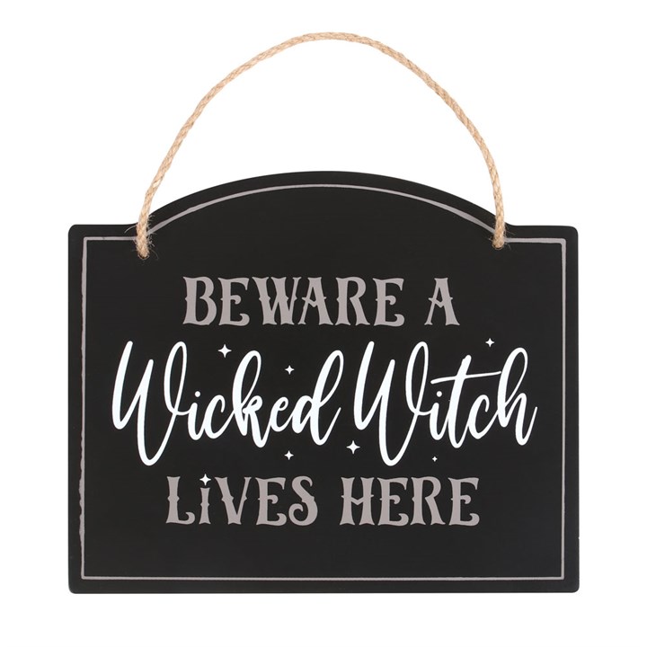 This quirky hanging sign is the perfect way to decorate for a spooktacular Halloween with fun 'Beware A Wicked Witch Lives Here' text accented with a dash of magic. Perfect for a door or entryway, this sign is a must-have for any witchy decor enthusiast.