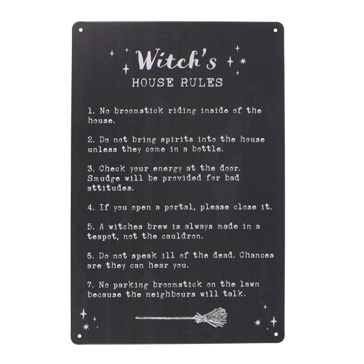 Decorative metal 'Witch's House Rules' sign which is a must-have accessory for any magical household. Product Dimensions: H30cm x W20cm x D0.2cm Packaged Dimensions: H30cm x W20cm x D0.2cm