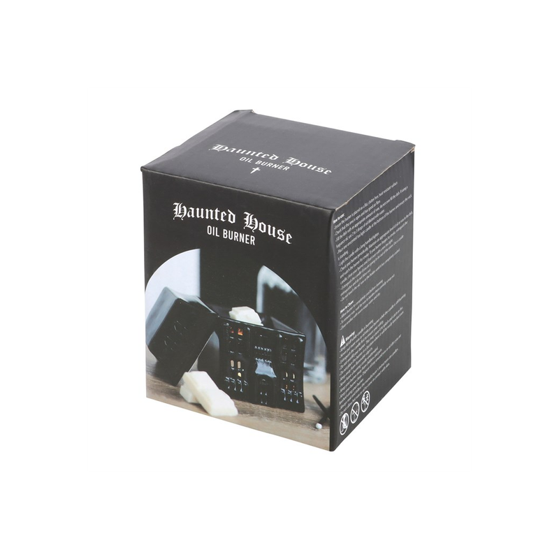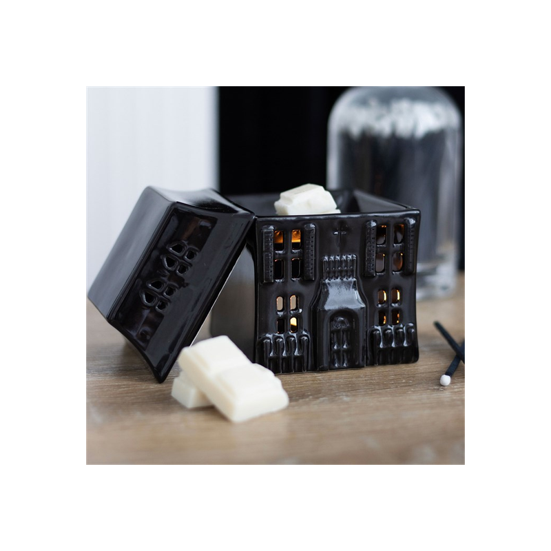 Add a touch of haunted elegance to your home with this haunted house oil burner and wax warmer. Suitable for both wax melts and diluted fragrance oils, this spooky piece creates a warm glow while diffusing your favourite eerie aromas. Simply place a tealight in the holder, remove the lid while in use, and enjoy. Always allow to cool before handling.