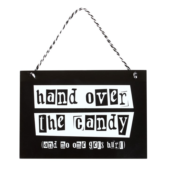 Trick or treaters will think twice before approaching any homes displaying this tongue in cheek warning sign that reads 'Hand over the candy (and no one gets hurt)'. Designed in a contrasting black and white colourway for maximum impact.