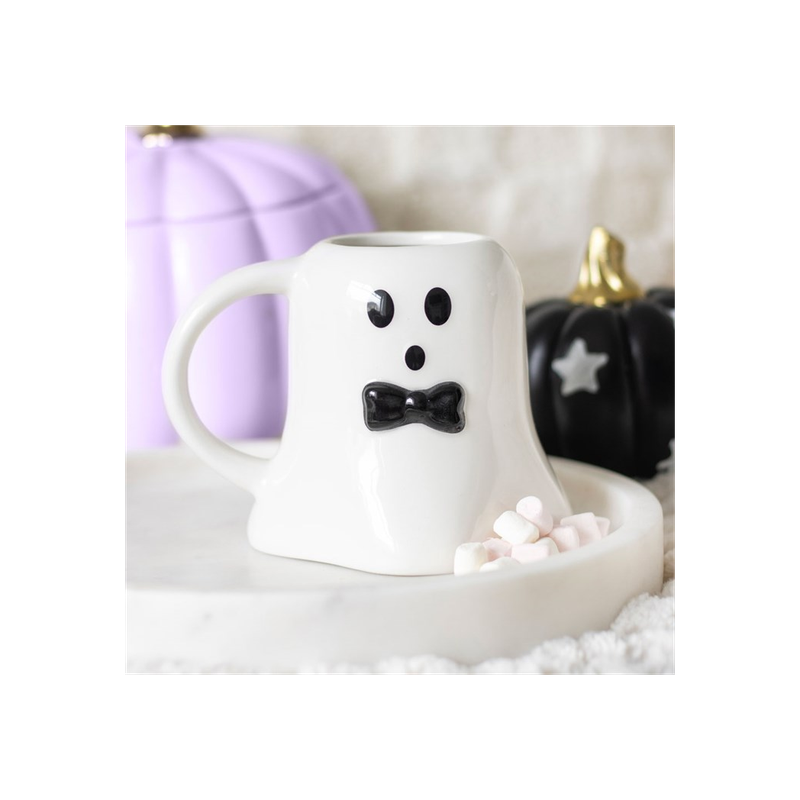Introducing the delightful Mr Boo ghost-shaped mug, adorned with a sleek black bow tie and perfect for the Halloween and autumn season. This charming mug holds 440ml and is ideal for both hot and cold drinks. Celebrate the spooky season in style with this fun and functional addition to any mug collection.