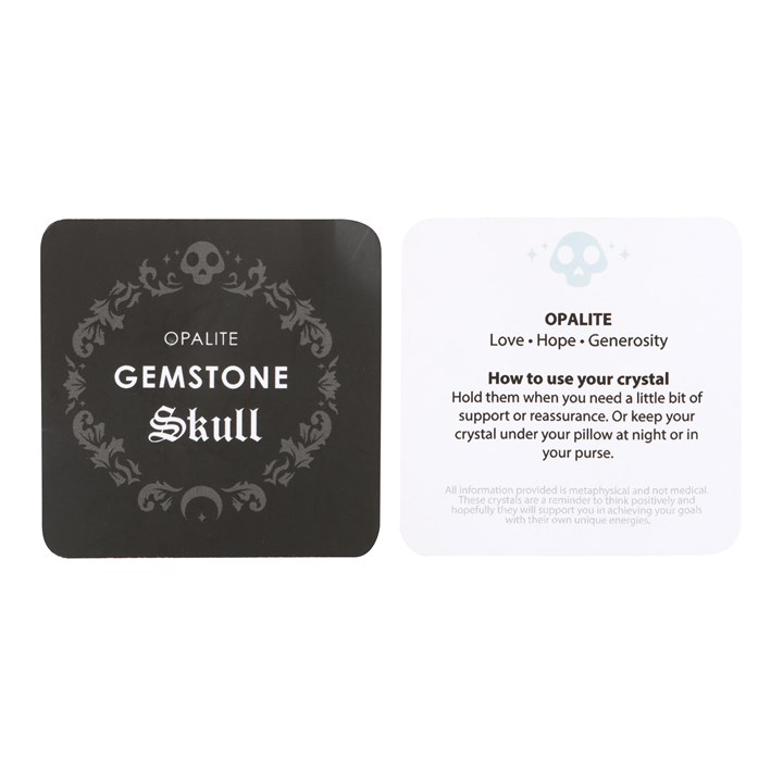 This crystal skull is made from opalite which is a stone renowned for its ability to evoke feelings of love, hope, and generosity. The skull is the perfect size for holding in the palm of your hand then you need a little support or reassurance. This unique piece serves as a stylish desk accessory, always within arm's reach for those moments of need. Presented in a black drawstring pouch for keeping the skull safe whilst on the go.