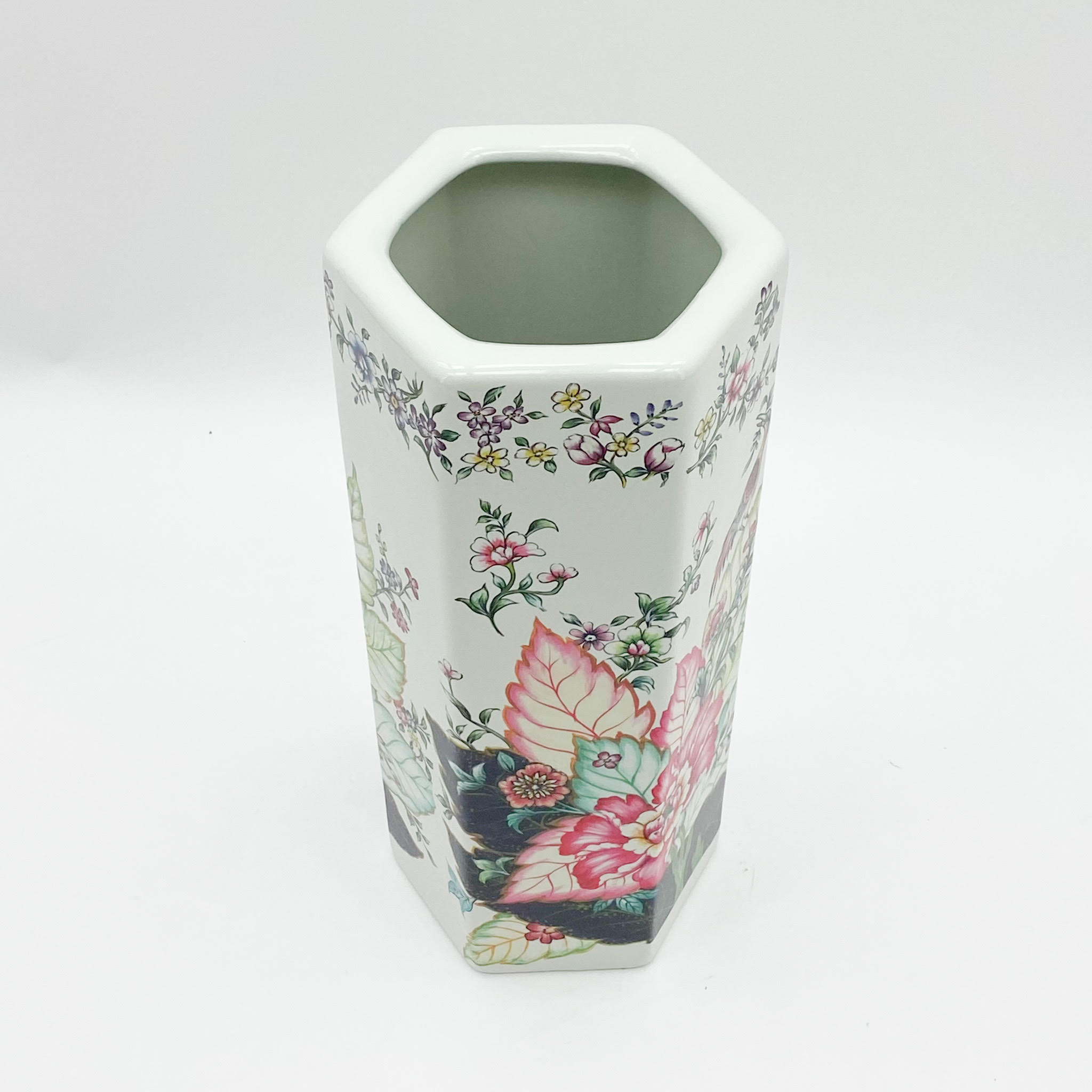 18″ Hex Umbrella Stand. This traditional style umbrella stand can also be used as a large vase for fresh or dried flowers or even ornamental twigs & branches. Slight imperfections to give an antique feel glazed.