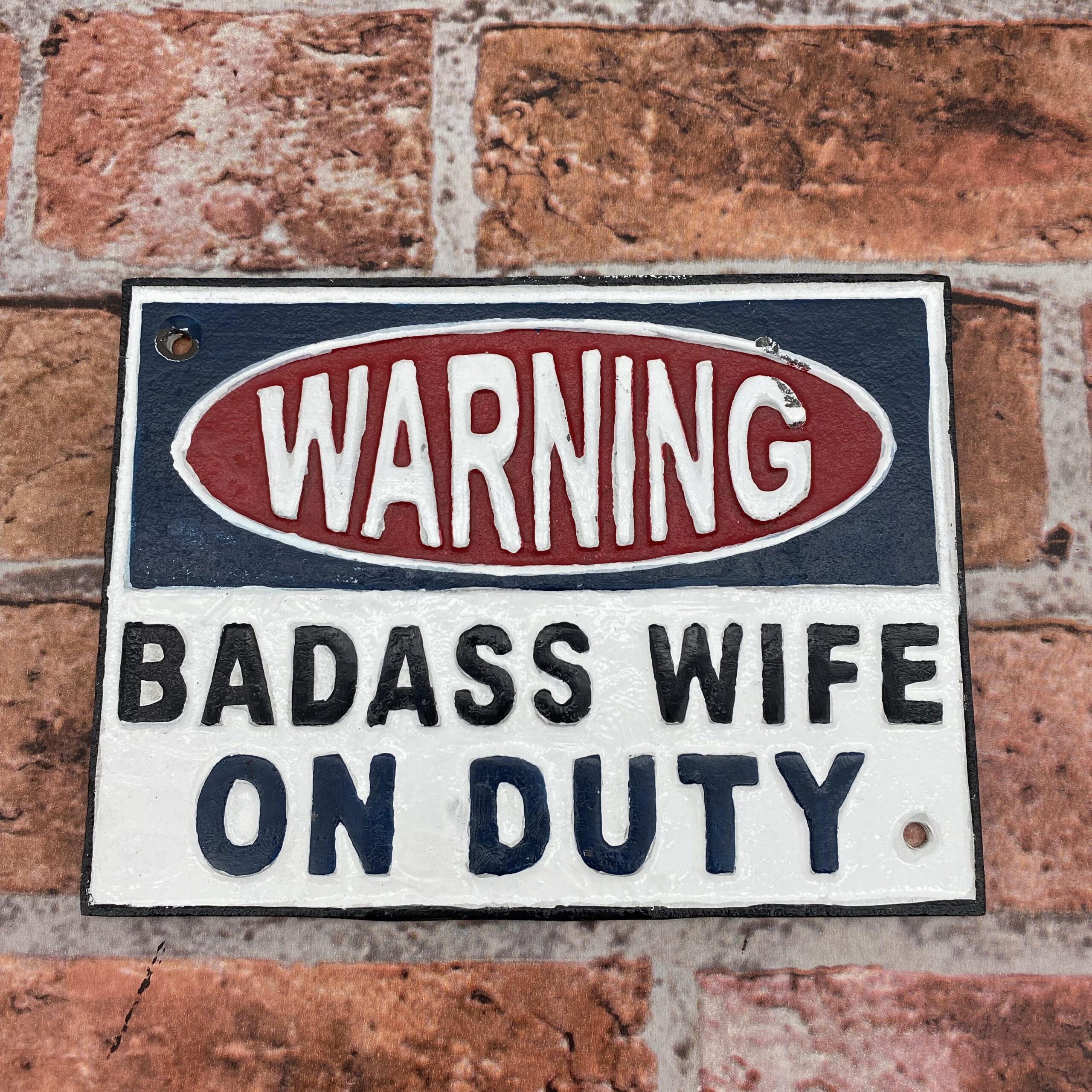 Add a bold and humorous touch to your home décor with this 28 cm cast iron warning plaque. Featuring the striking message “Warning: Badass Wife On Duty,” this durable sign makes a fun statement piece for any room, garden wall, workshop, or man cave. Crafted from high-quality cast iron, it offers a rustic, vintage feel while remaining strong enough for long-term indoor or outdoor display.