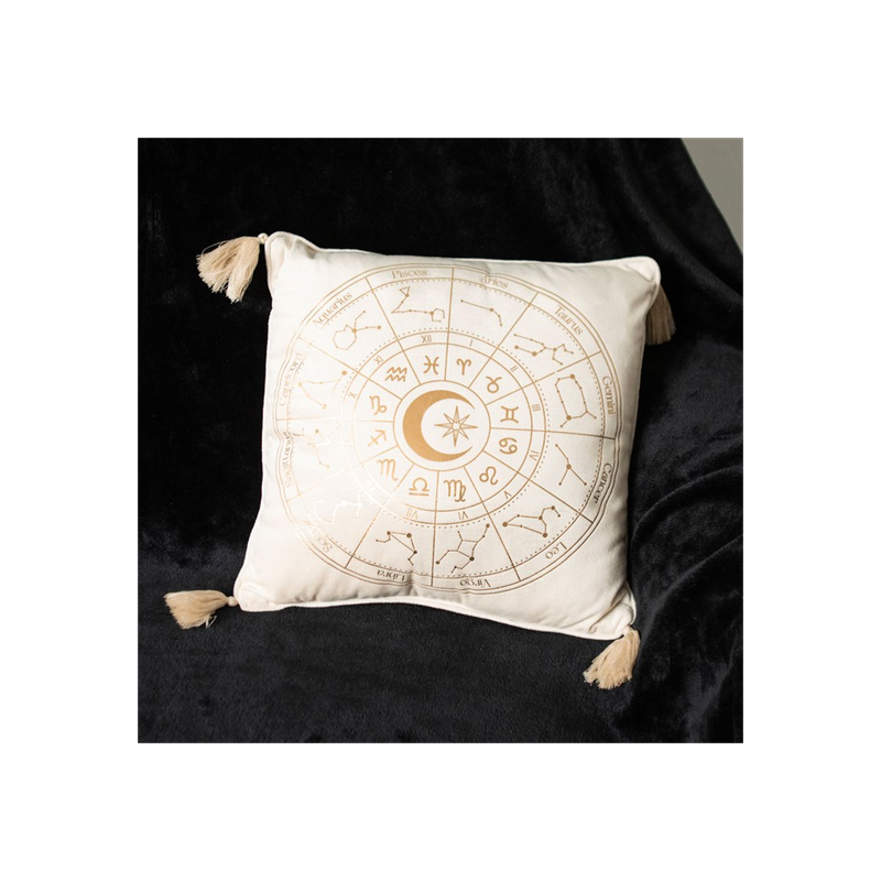 Add a touch of celestial elegance to the home with this Astrology Wheel square cushion. This off-white cushion features a metallic gold finish adorned with tassels for a stylish and cosy addition to any room. This 35m square cushion is made from 100% polyester and is suitable for dry clean only.