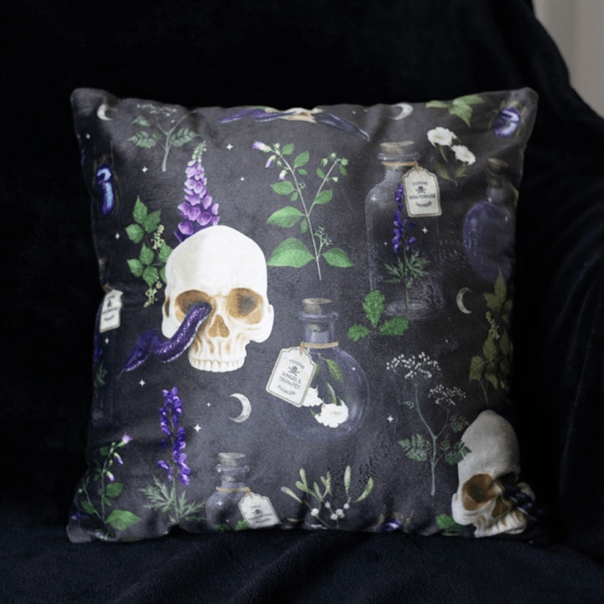 Bring comfort and style to your space with this 35cm square polyester cushion, featuring a darkly enchanting design of skulls, serpents and poisonous plants. Ideal for sofas, chairs, or beds, it adds a bold, gothic touch to any home.