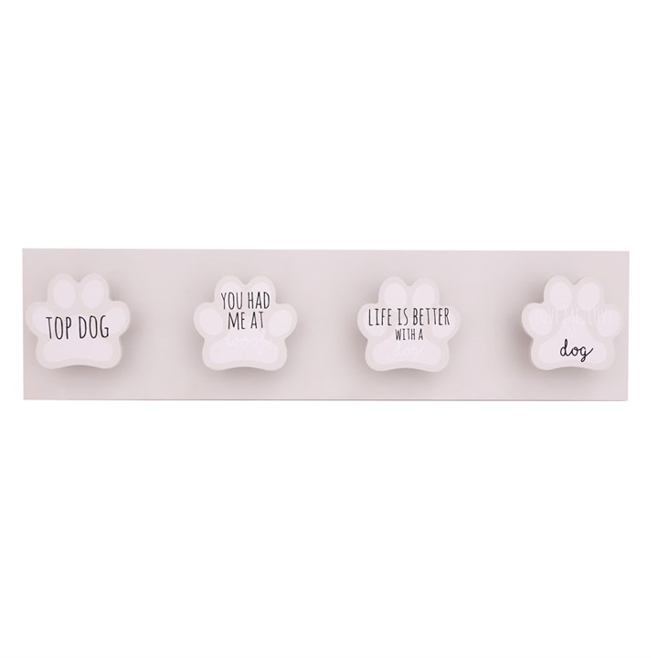 Perfect for any dog owner, this wall hook features 4 paw-shaped pegs for holding leads, harnesses, jackets, keys and more.