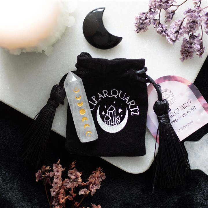This beautiful clear quartz crystal point is perfect in size for travel altars, desk decor or taking on the go for extra protection. Features a gold-tone moon phase engraving and comes with a matching drawstring bag for storage and safe-keeping.