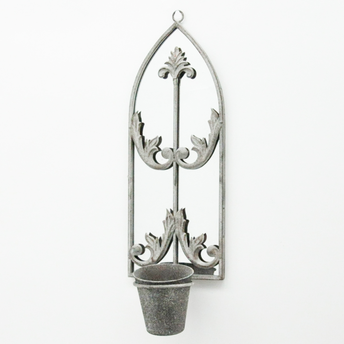 64cm rustic arched wall mirror with single planter, a decorative metal mirror with an antique finish, complete with 1 planter holder and pots. Hard-wearing Distressed Metal.