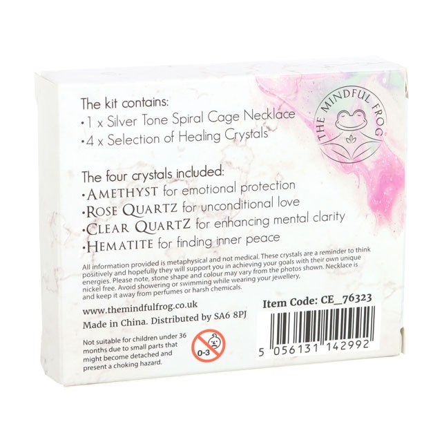 Start every day with a different pendant with this ‘build your own’ crystal necklace kit. Includes 4 tumblestones and a nickel-free spiral cage necklace for easily swapping out the stones. Crystals include amethyst rose quartz, clear quartz and hematite presented in a matching gift box. Due to their nature, size, shape and colour of stones will vary.