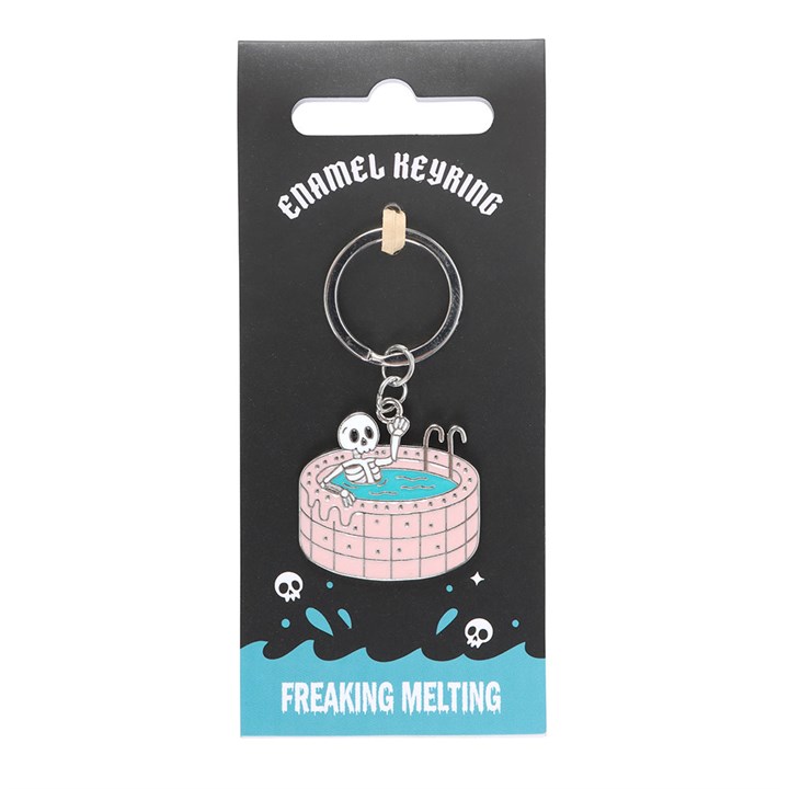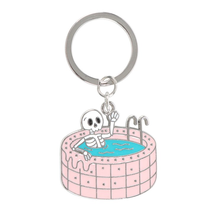 Chilled to the bone. This Dead Cool skeleton enamel keyring features a relaxed skeleton soaking in a pink swimming pool, bringing a tongue-in-cheek edge to your keys or bag. A must-have accessory for fans of playful gothic style with plenty of personality.