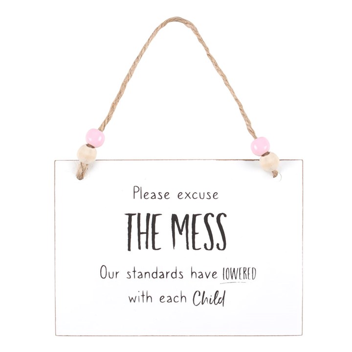 The perfect token gift for family and friends, this white wooden hanging sign features the text ‘Please excuse the mess, our standards have lowered with each child’. Approximately 10cm x 14cm with twine hanger and finished with a wooden beads.