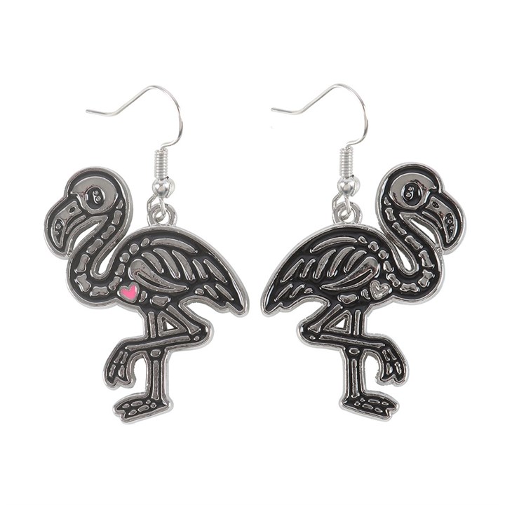 Flamingo, but make it gothic. These Flamin-goth dangle earrings feature skeletal flamingo charms with a subtle pink heart detail for a playful alternative edge. Lightweight and eye catching, they are perfect for adding personality to everyday outfits or finishing off a bold look. May contain traces of nickel and is made from alloy in accordance to REACH specification.