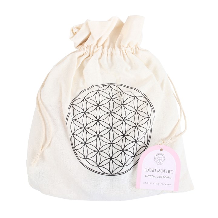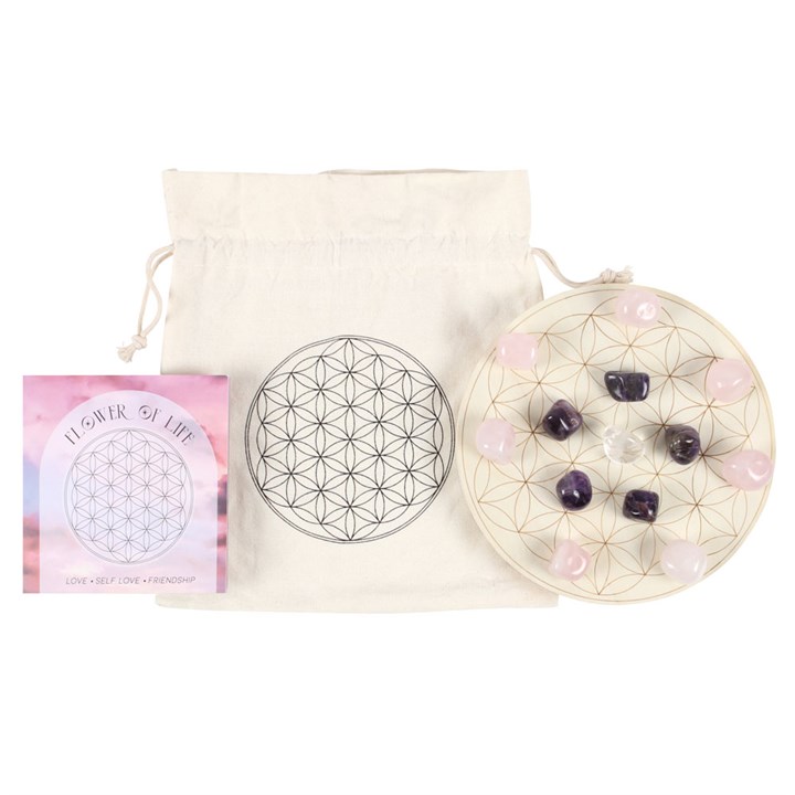 Practice the spiritual art of amplifying energies with this lovely crystal grid set. The Flower of Life is a geometric pattern widely recognised as a visual representation of the interwoven connection between all things. This set includes everything needed to arrange your own crystal grid for attracting love, self-love and friendship; 7 rose quartz tumblestones, 5 amethyst tumblestones, 1 clear quartz tumblestone, an engraved wooden grid and an instructional insert card all presented in a printed drawstring bag Product Dimensions: H1.5cm x W18cm x D18cm Packaged Dimensions: H2.5cm x W20cm x D25cm m