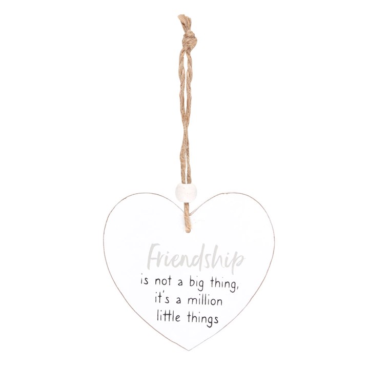 The perfect token gift for family and friends, this white sentiment wooden heart decoration features the words ‘Friendship is not a big thing, it’s a million little things’. Approximately 8cm x 8cm with twine hanger and finished with a wooden bead.