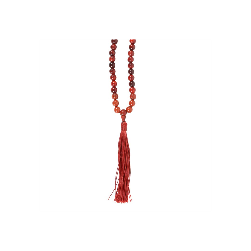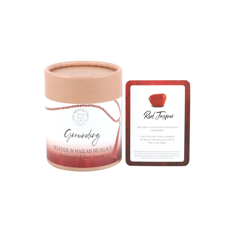 Crafted from rich, warm rosewood beads and interlaced with striking Red Jasper stones, this elegant necklace showcases 108 beads ? a traditional number in Mallah necklaces symbolizing spiritual journey and mindfulness ? and is finished with a decorative tassel. The Red Jasper, known for its grounding properties and associated with the root chakra, is believed to instill stability, stamina, and a deep connection to the earth, nurturing courage and wisdom in the wearer. A Mallah, or Mala, necklace is a string of beads traditionally used in meditation and prayer in various spiritual practices, including Buddhism and Hinduism. Each bead represents a repetition of a mantra or prayer, aiding in focus and spiritual contemplation. To use, simply hold the necklace in one hand and move from bead to bead while focusing on mindful breathing and repeating an intention. The necklace can also be worn throughout the day as a reminder of these intentions, serving as a grounding tool in your daily life. Each Grounding Rosewood and Red Jasper Mallah Necklace is presented in a beautifully designed box, accompanied by a corresponding information card, making it an ideal and thoughtful gift for a loved one who seeks balance, grounding, and a deeper connection to their inner strength.