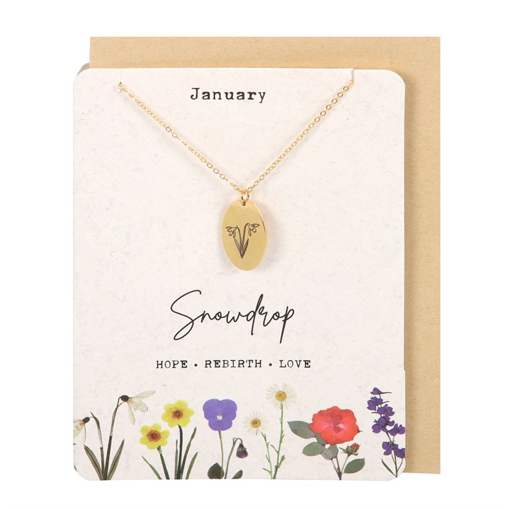 This lovely greeting card features a timeless wildflower design and holds a gold-tone necklace adorned with the recipient’s birth flower, making it a thoughtful surprise for birthdays, Mother’s Day, milestone moments and more. Symbolising hope, rebirth and love, the snowdrop flower is a meaningful token for those born in the month of January. Includes engraved flower charm on a 22cm nickel-free chain. Card left blank inside. Envelope included.