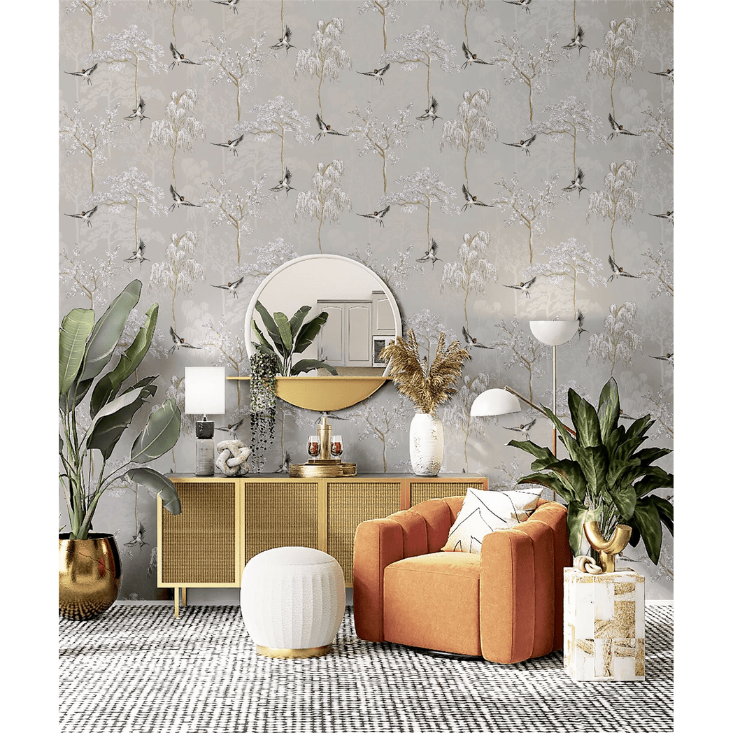 Bring a sense of calm and sophistication to your space with this Japanese Garden Wallpaper in soft grey. The eye-catching design features beautifully hand-drawn oriental trees and graceful birds, creating a serene, nature-inspired look.