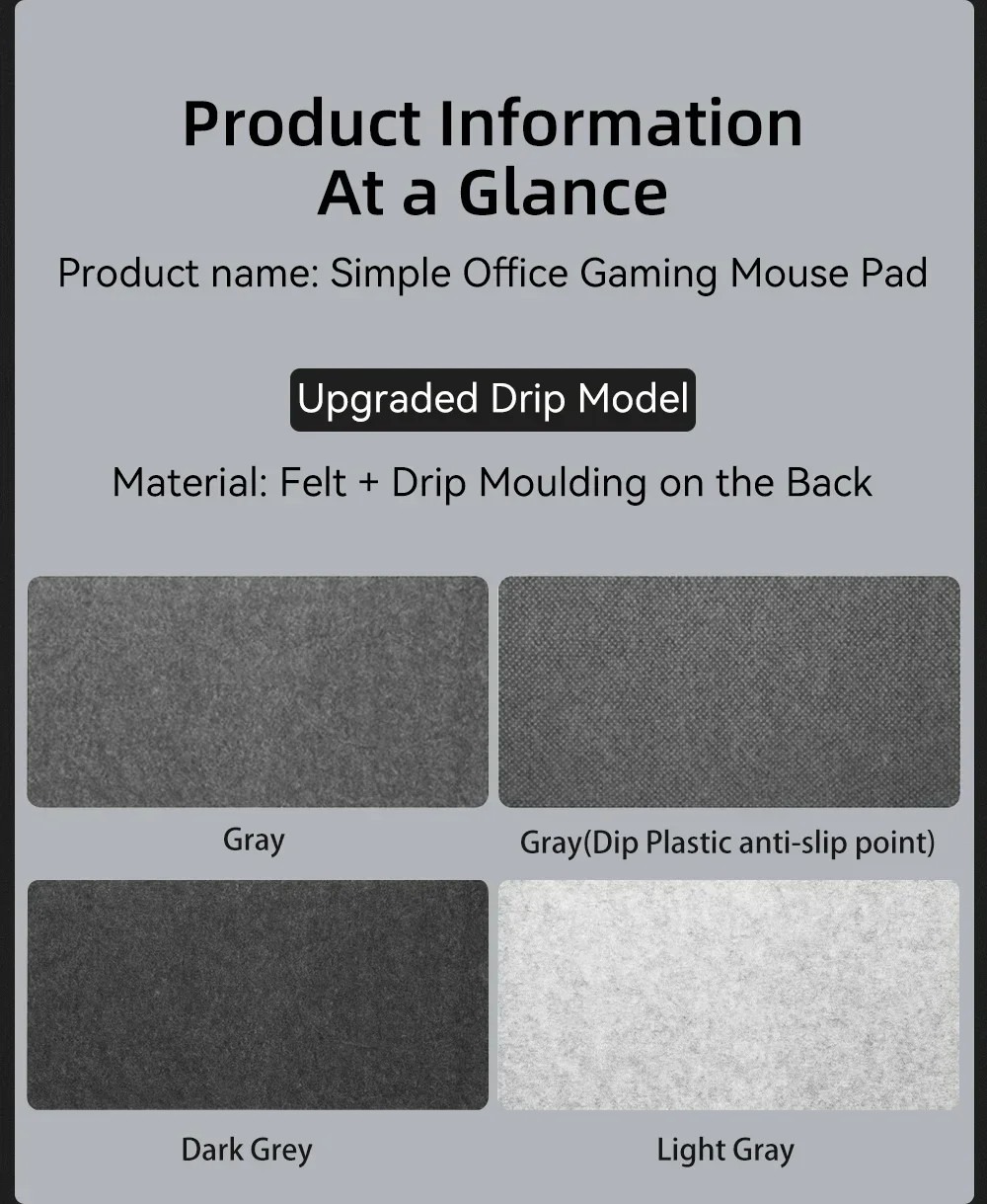 Add style and functionality to your workspace with this large wool-felt mouse pad. It provides a soft cushion for your mouse, keyboard, and laptop, allowing you to move smoothly and precisely during work or gaming sessions. With its elegant texture, it adds a touch of sophistication to any office or home setup while effectively protecting your desk from scratches and spills. Designed to enhance your computing experience, this versatile accessory is perfect for gamers and professionals alike.