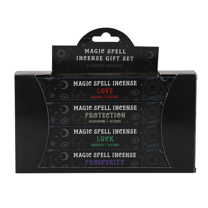 Great for accompanying spell work and altars, this magic spell incense gift set includes 4 individual packs of incense sticks for Love, Protection, Prosperity and Luck. The perfect gift fit for any witch! Place the stick on an incense holder and after a few seconds of lighting it, blow on the flame and let the incense burn to the end. The incense will subtly release its perfume of Red Rose, Black Opium, Green Tea or Lavender, imbuing the atmosphere with serenity. Please practice caution when burning and never leave lit incense unattended.