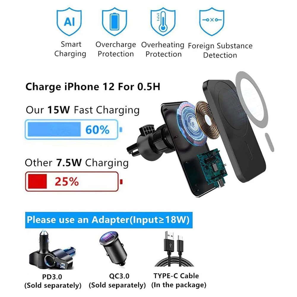 Magnetic Wireless Car Charger Air Vent Phone Stand – 15W Fast Charging Dashboard Phone Holder for iPhone 15, 14, 13, and 12