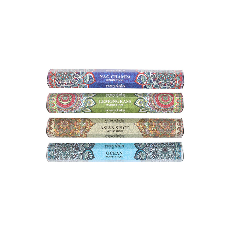This gift set contains four packs of incense sticks in various fragrances and comes presented in a beautifully designed Mandala print box.