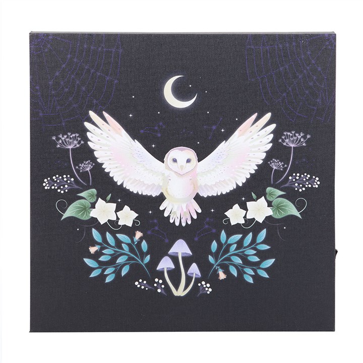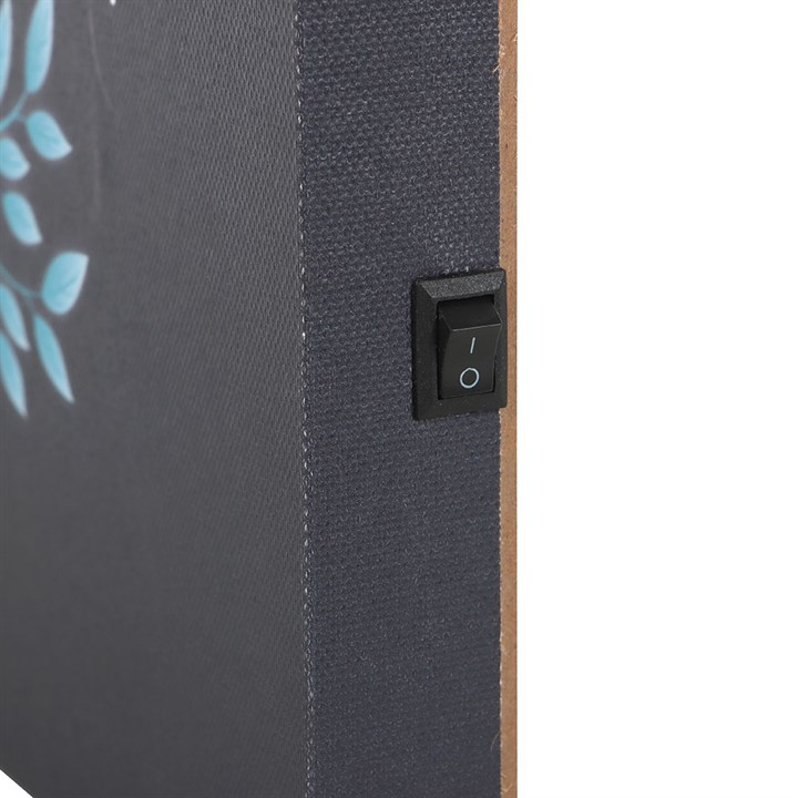 Add a touch of magic to your space with this 30x30cm light-up wall canvas. Features a mystical moth and plant design with embedded LED lights to create a mesmerizing glow. Please note that the switch is located on the side of the canvas and may be slightly obscured by the packaging upon delivery. Requires 2 x AA batteries. Designed by Something Different Wholesale and part of the Night Flight range of mystical owl gifts and home decor.
