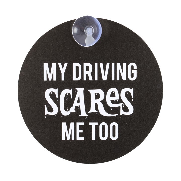 Lighten the mood out on the road with this fun window sign which reads ‘My driving scares me, too’. Perfect for letting your dark sense of humor shine through on the daily commute.