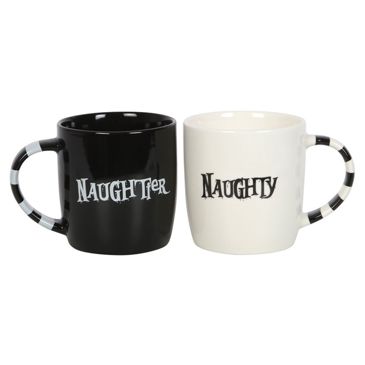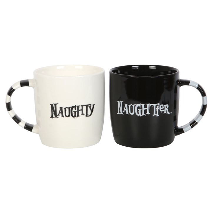 Show off your mischievous side with a spooky set of mugs. This creepy take on classic Christmas features ‘Naughty’ and ‘Naughtier’ text with matching back and white striped handles. Whether you’re a troublemaking couple or a wicked pair of BFFs, these mugs are the perfect addition to your spooky mug collection! 350ml capacity per mug. Microwave safe.