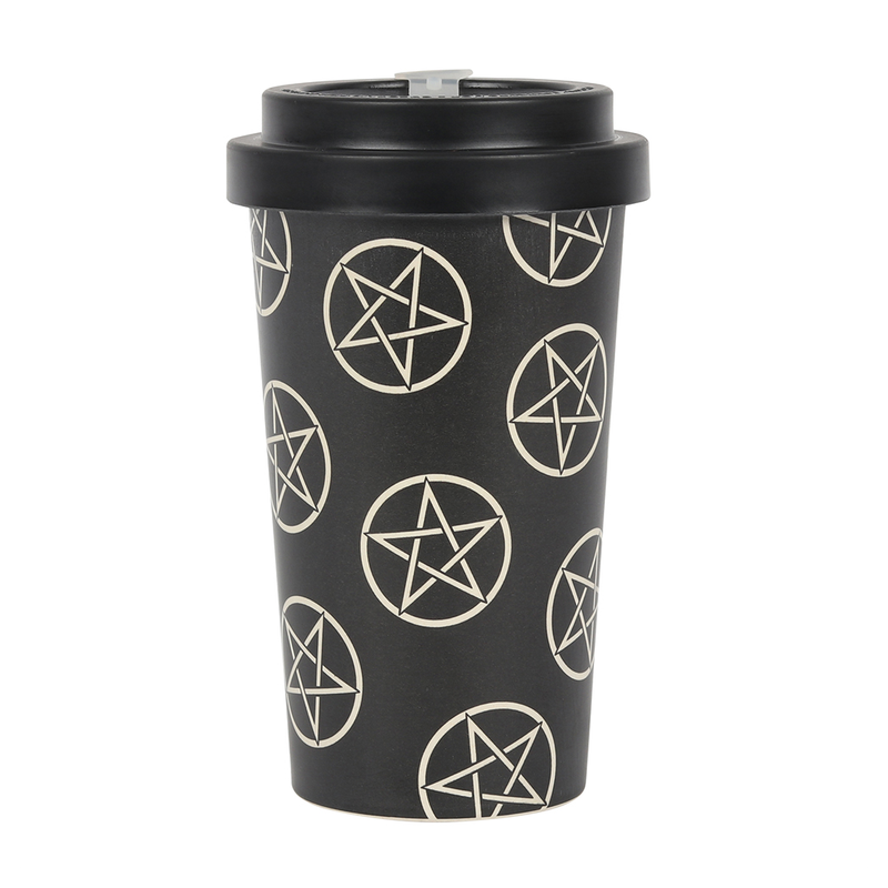 This eco-friendly, reusable travel mug is made out of durable bamboo fibre and comes with a matching silicone sleeve and lid for keeping hydrated (and caffeinated) on the go. This gothic style features an allover pentacle design and also includes a convenient stopper to prevent accidental spills. Dishwasher safe mug with hand wash only lid and sleeve. Do not microwave. Packaged Dimensions: H15.6cm x W9.9cm x D9cm”
