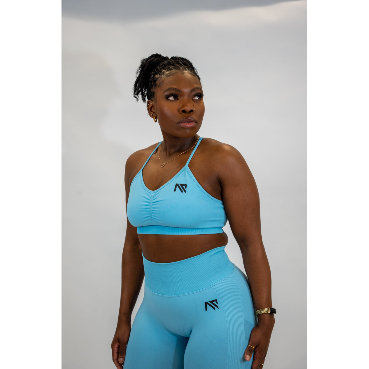 The soft, stretchy fabric feels like a second skin, offering exceptional breathability and freedom of movement—ideal for lifting sessions, cardio, yoga, and everyday athleisure. The scrunched detailing at the chest and on the leggings enhances shaping, while the adjustable bra straps allow a personalised, secure fit.