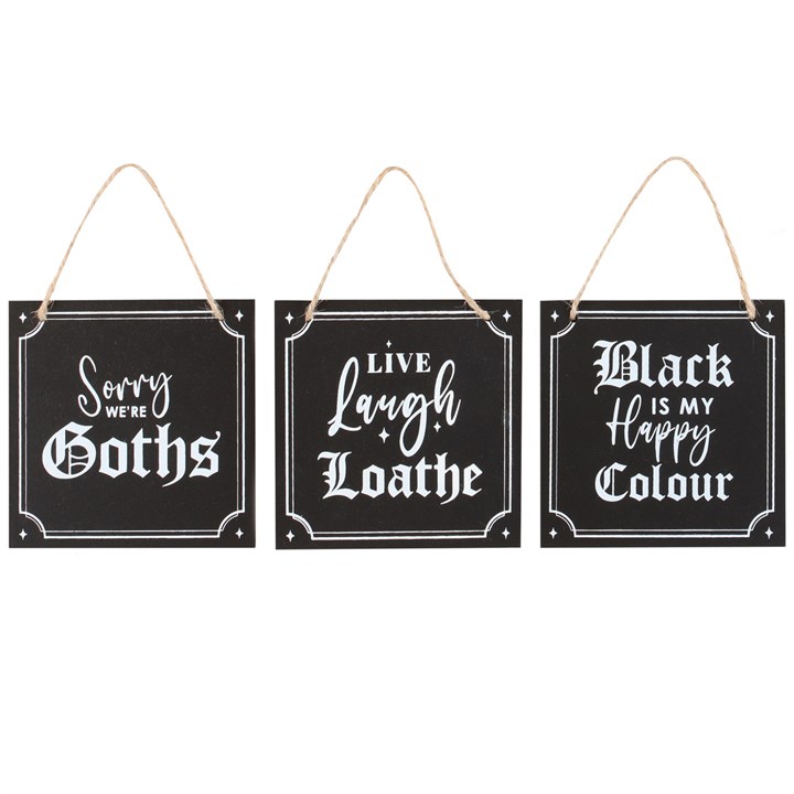 This collection of 12 gothic-themed mini signs are crafted from durable MDF. Featuring comical phrases making them perfect for adding a touch of dark elegance to home decor. Includes light brown rope for easy hanging and two of each design. Phrases include: x2 ‘Strange as usual’ x2 ‘I’m already disturbed. Please come in’ x2 ‘Not today, Satan’ x2 ‘Sorry, we’re goths’ x2 ‘Live, laugh, loathe’ x2 ‘Black is my happy colour’