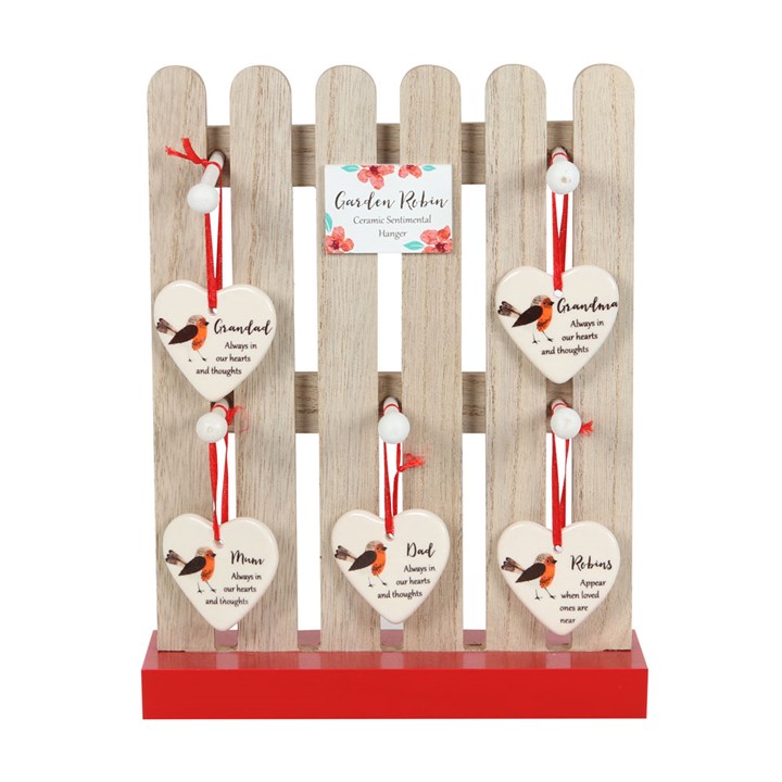 Bring extra love and comfort to those who have lost someone close with this display of hanging heart decorations. Five meaningful designs feature a robin illustration with phrases that include, ‘Grandad/Grandma/Mum/Dad: Always in our hearts and thoughts’ and ‘Robins appear when loved ones are near.’ Includes 30 ceramic heart decorations, 6 of each phrase, on a matching MDF display.