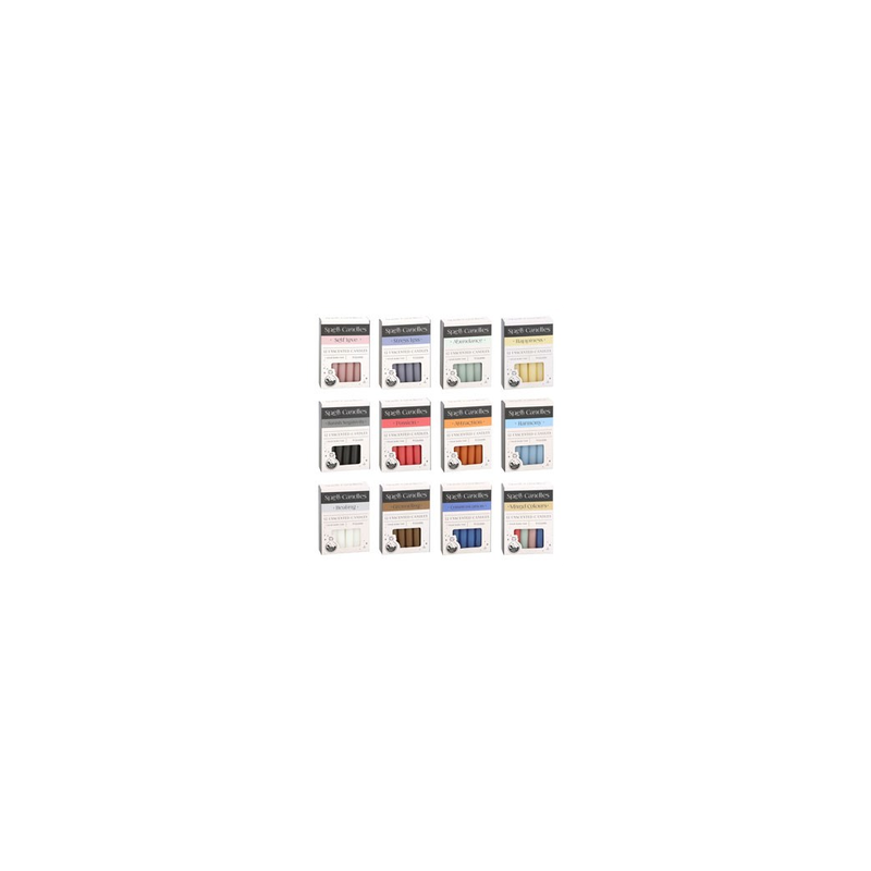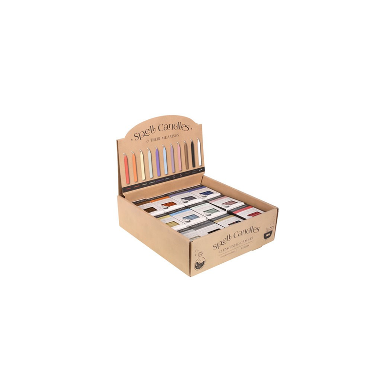 Enhance your magical practice and manifest your intentions with this set of 48 unscented spell candles. Candle magic is one of the simplest forms of spell casting in which the caster decides on a goal, visualizes the end result and focuses intent to manifest that result. Packaged in a beautifully designed cardboard display featuring a description of each candle’s intent. The colour of a spell candle holds significant symbolism and corresponds to different intentions and energies, making it an essential element in ritual and spellcasting. Typically, the caster will write down their intent on a piece of paper the same colour as the candle and burn the paper in a fire safe bowl. Each pack includes 12 spell candles, and the display includes 4 packs each of the following colours: red for passion, orange for attraction, yellow for happiness, green for abundance, light blue for harmony, blue for communication, purple for stress less, pink for self love, brown for grounding, black for banish negativity, white for healing and mixed spell candles.