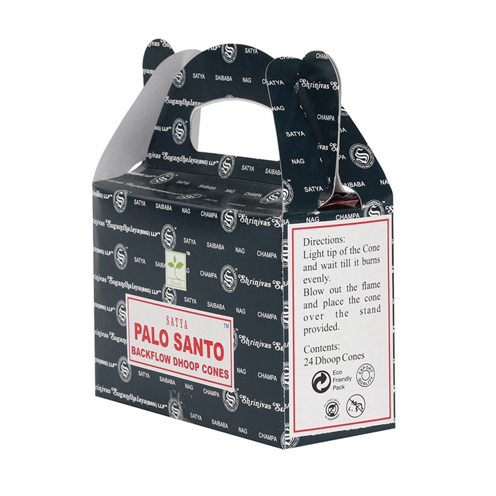 This display box contains 6 packs of beautifully scented Palo Santo backflow incense cones developed by Satya. The cones are crafted using the highest quality ingredients to offer longlasting fragrance. Use these cones with a backflow incense burner to create stunning smoke displays. Product Dimensions: H11cm x W10cm x D4cm Packaged Dimensions: H11.5cm x W20.5cm x D12.5cm