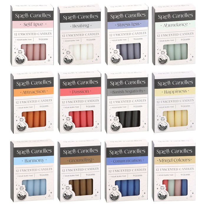 This retail display set includes 72 packs of our popular unscented spell candles in a black tabletop spinner. Eye-catching and space-saving, this display set maximises counter space while encouraging quick browsing and add-on purchases. The spinner’s walled base allows for easy selling with our matching spell candle holders (sold separately), making it an efficient and attractive merchandising solution.