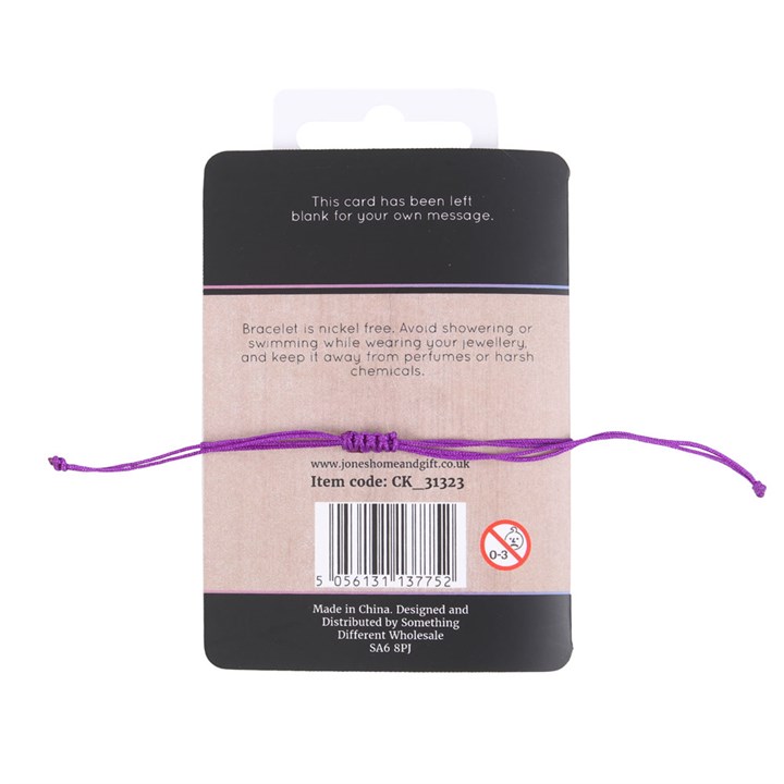 Balance and realign the third eye chakra with this purple string and metal charm bracelet. Presented on a matching backing card that reads, ‘Intuition, psychic abilities, foresight, perception, vision’. Product Dimensions: H1.9cm x W2.4cm x D0.8cm Packaged Dimensions: H2.3cm x W13cm x D2cm