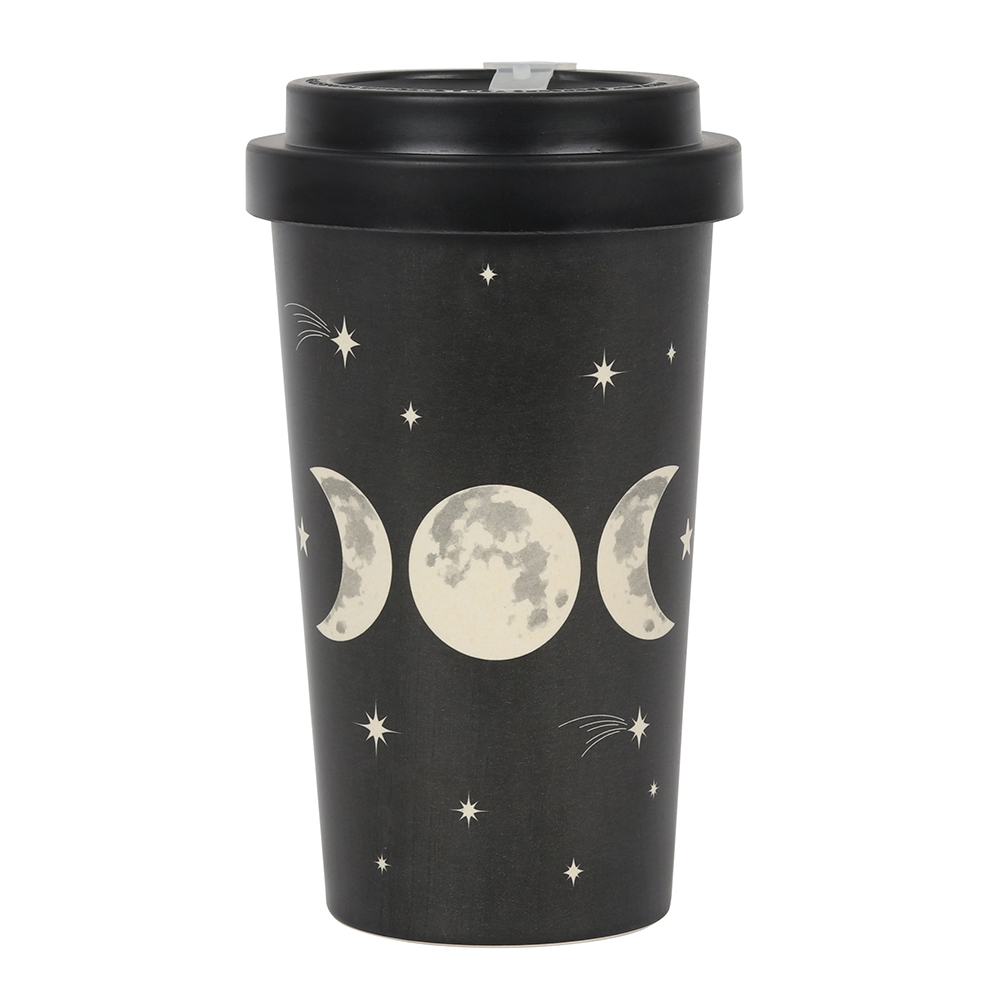 This eco-friendly, reusable travel mug is made out of durable bamboo fibre and comes with a matching silicone sleeve and lid for keeping hydrated (and caffeinated) on the go. This gothic style features a triple moon design on a starry sky and also includes a convenient stopper to prevent accidental spills. Dishwasher safe mug with hand wash only lid and sleeve. Do not microwave. Packaged Dimensions: H15.6cm x W9.9cm x D9cm”